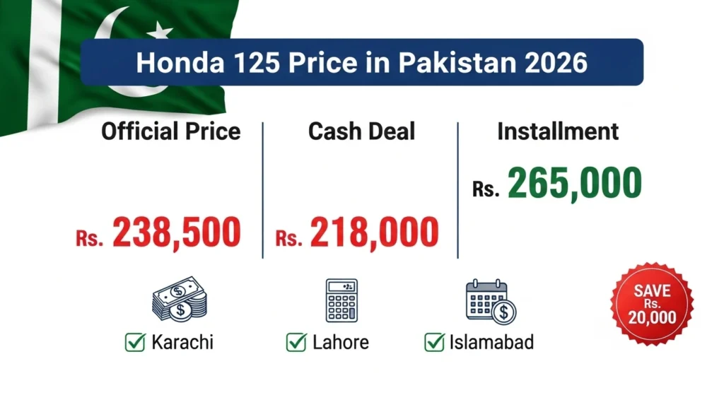 - Official Price: Rs. 238,500 (Honda 125 Standard, April 2026)