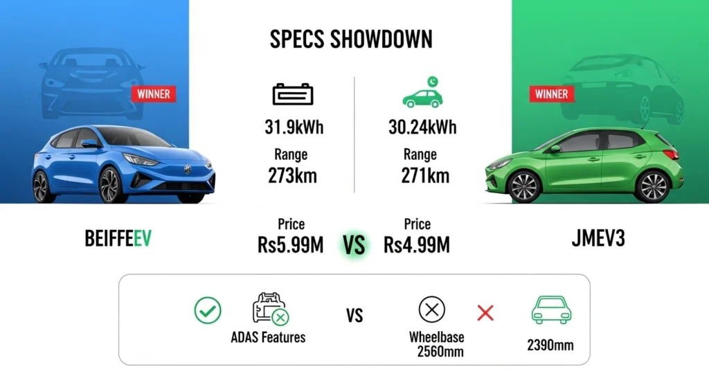 Both use Lithium Iron Phosphate Battery (LFP) tech. Safer. Longer life. Better for Pakistan’s heat than old lithium-ion. MG Bingo EV: 31.9 kWh JMEV3: 30.24 kWh The MG has slightly more capacity. But range? Almost identical. JMEV EV3 Price in Pakistan: The Most Affordable 5-Door EV is Here!